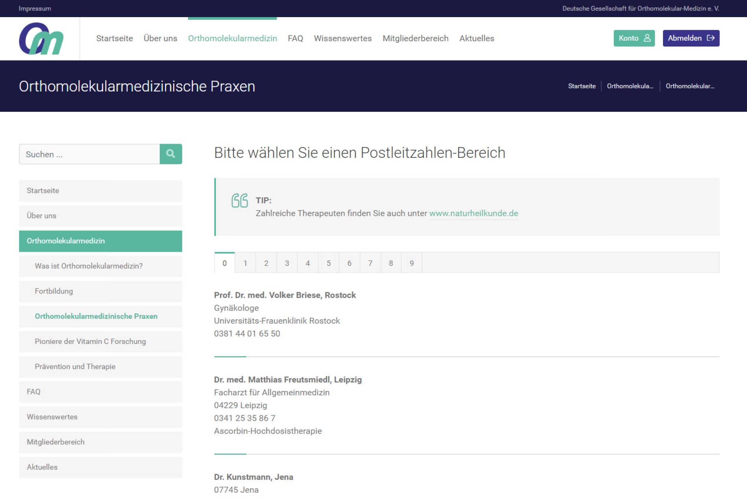 Verzeichnis angeschlossener Praxen, sortiert nach Postleizahlen